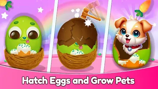 Hatch eggs to bring adorable animals like bunnies, kittens, and puppies into the world. Feed your pets, give them baths, and train them with potty training tasks. Enjoy realistic animal sounds and watch your pet grow and thrive as you care for it.